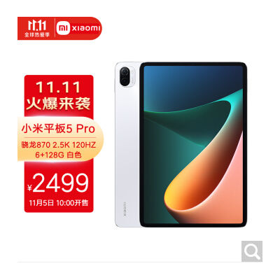 商品名称:小米平板5 Pro 2021款11英寸2.5K高清屏 120Hz 骁龙870 67W快充 杜比影音娱乐办公平板电脑6G+128GB 白色